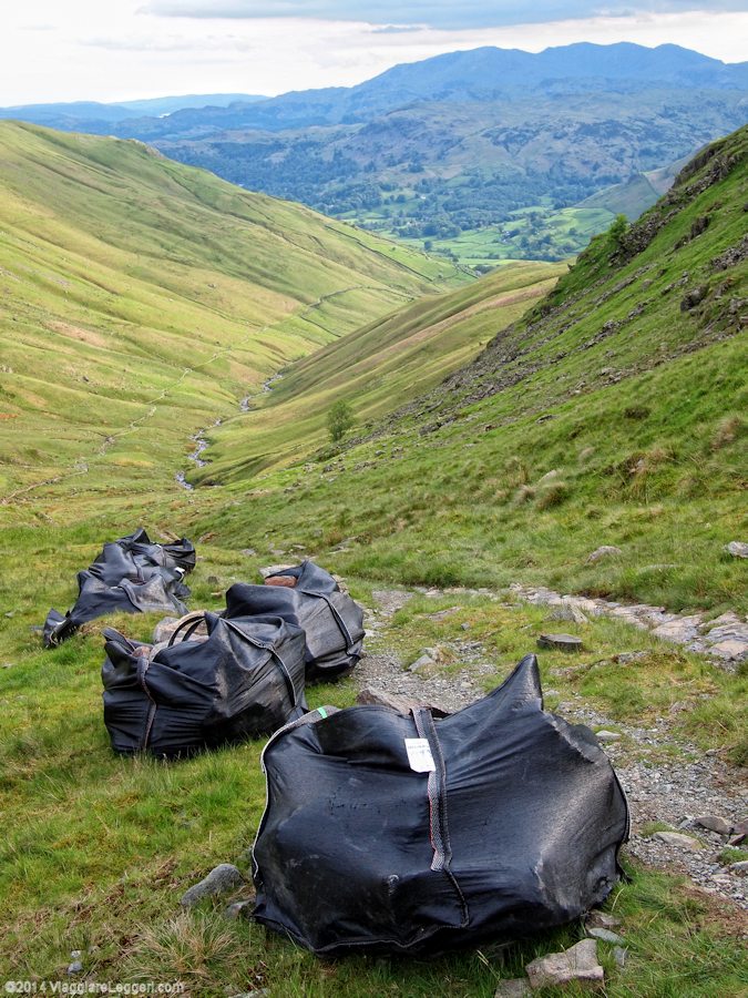 E io che pensavo che il mio zaino fosse pesante! Questi sacchi (simili a quelli visti vicino a The Chimney, lungo Striding Edge) contengono pietre che verranno utilizzate, credo, per la manutenzione dei sentieri. O forse che verranno portate a valle. Bisognerebbe chiederlo ai rangers del parco!