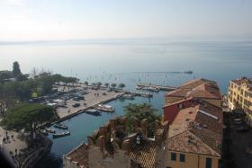 verso sud ovest: tetti, torri merlate - a coda di rondine, cioè ghibelline-, porto e, sullo sfondo, semi-nascosto dalla foschia, Desenzano del Garda