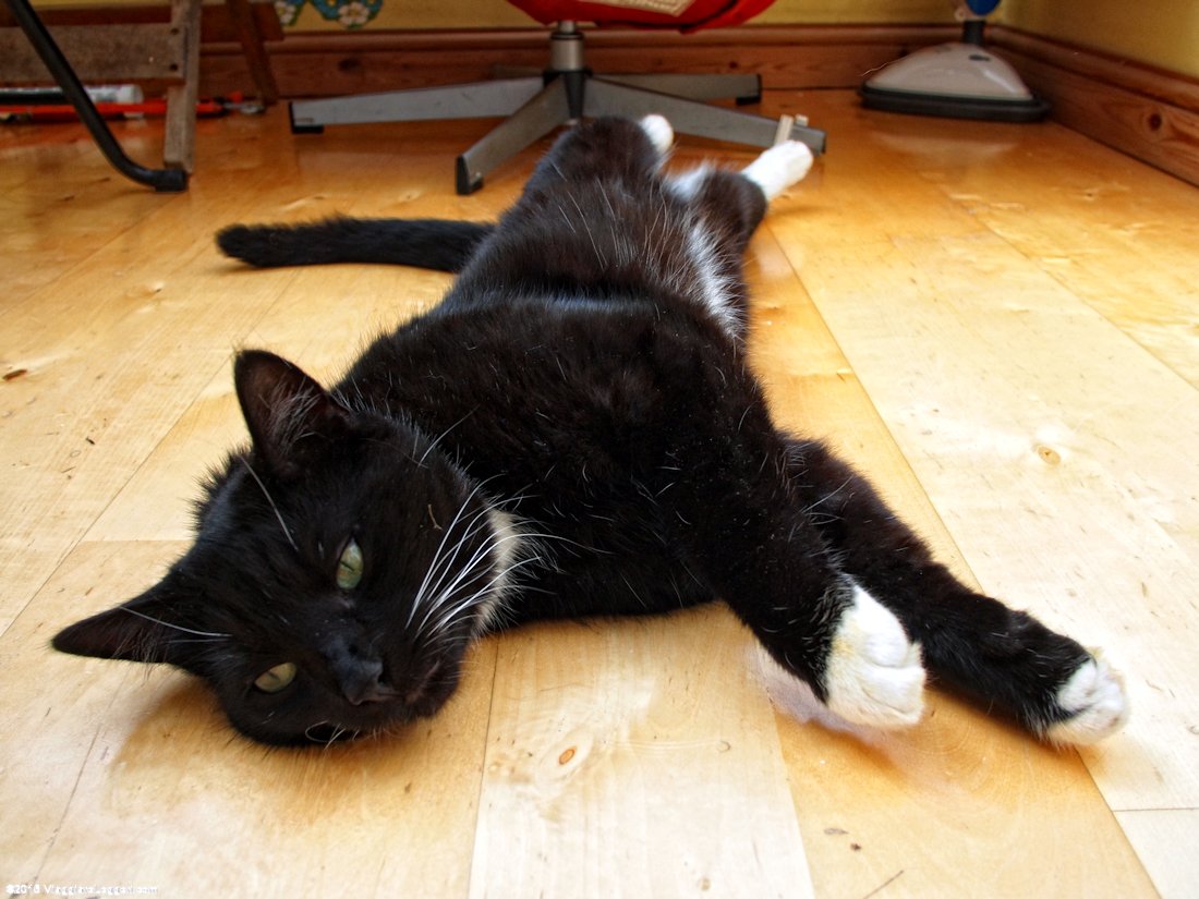 "Luminoso. Asciutto. Mi piace", disse il gatto. "Ora mi sdraio. Ecco, mi sono stravaccato sul pavimento."