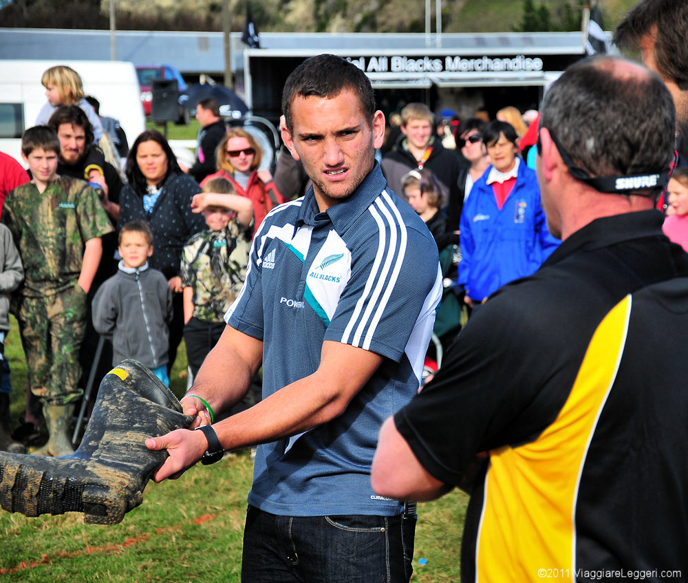 Aaron Cruden, stella emergente del rugby neozelandese, verifica con un arbitro che lo stivale che si appresta a lanciare sia delle dimensioni corrette.