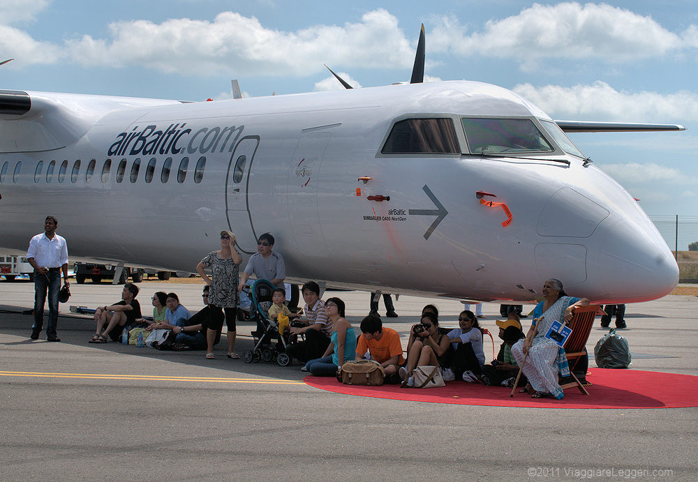 A Singapore ci sono almeno 32 gradi tutti i giorni, ma con l'umidita' sembrano molti di piu'. Ecco alcuni visitatori che cercano un po' d'ombra vicino ad un velivolo Bombardier Dash 8 della Air Baltic.
